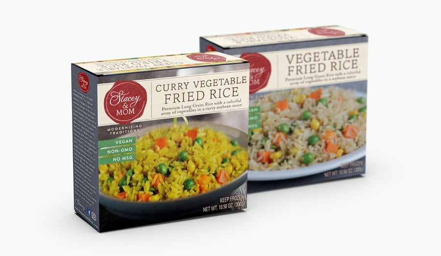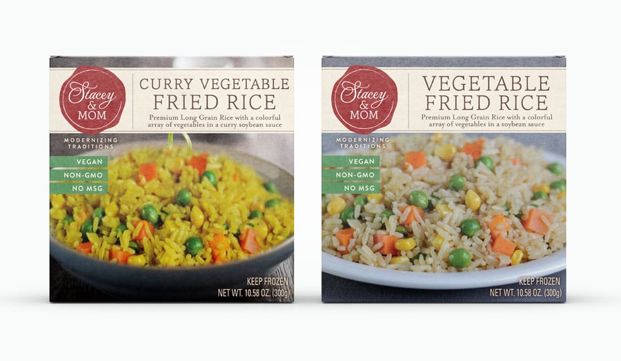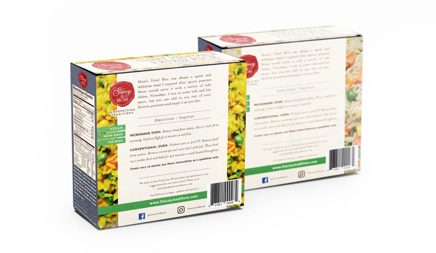 Jenn David Design partnered with Stacey & Co. to design these boxes for two varieties of frozen fried rice. We also designed their iconic red logo. The boxes feature a large beautiful product photo on the front with key selling points and their brand and product story with instructions on the back.