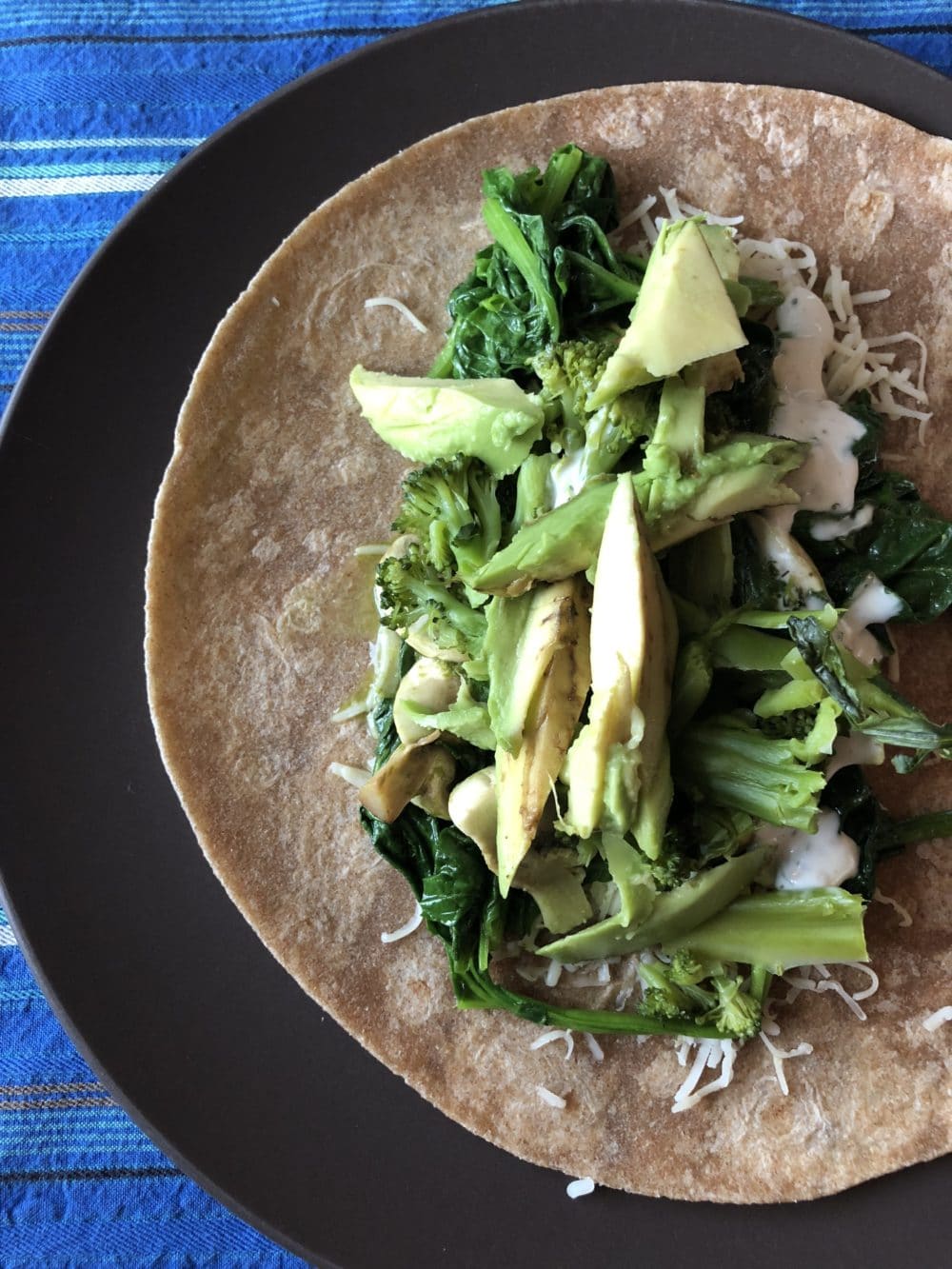 In same bowl, place broccoli and microwave about 45 seconds on high until softened. Place onto tortilla.