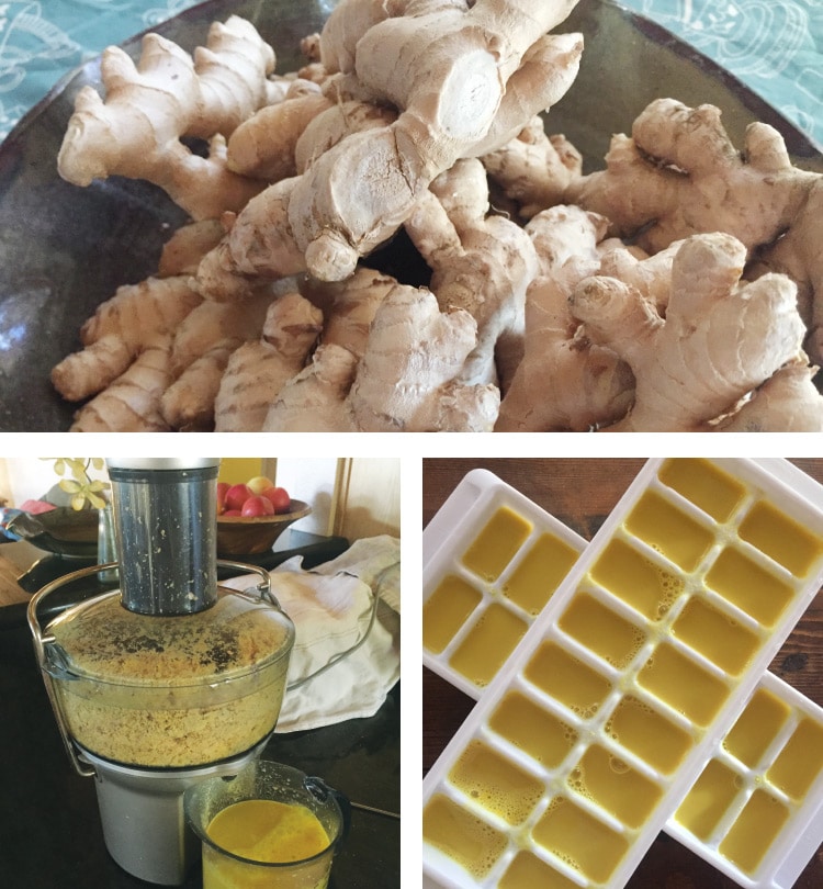 - For the ginger juice, I prefer to juice organic ginger root, skin and all, and then freeze it in ice cube trays. Each cube is about 2T. If you buy ginger juice you can also freeze it in this same manner.