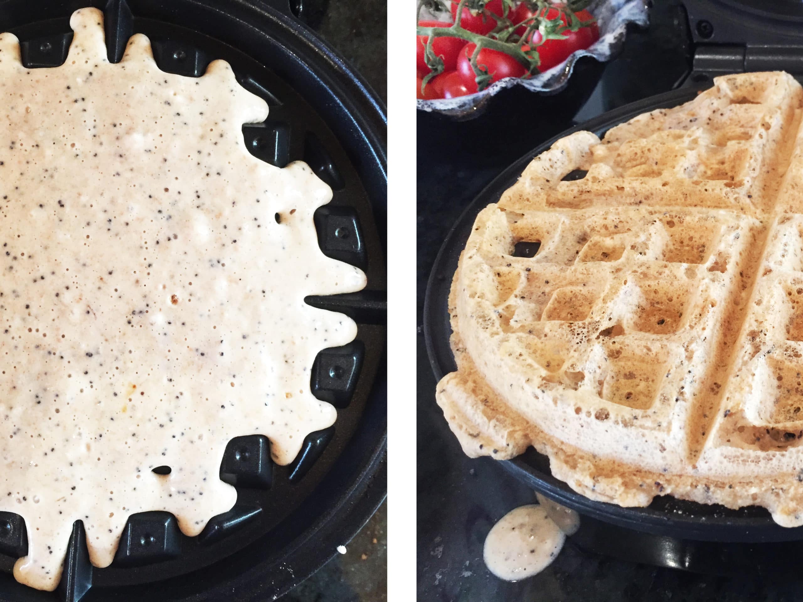 Pour about 2/3 C into a hot waffle maker or whatever amount your waffle maker calls for. Once the steam stops rising, it should be ready, but you can adjust that to less or more depending on whether you like your waffles softer or extra crispy.